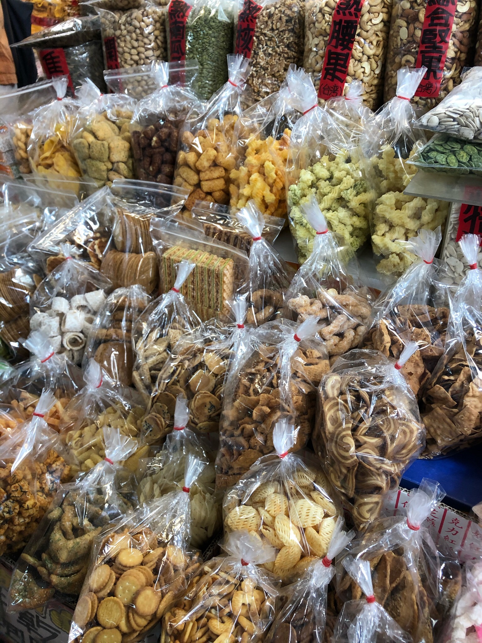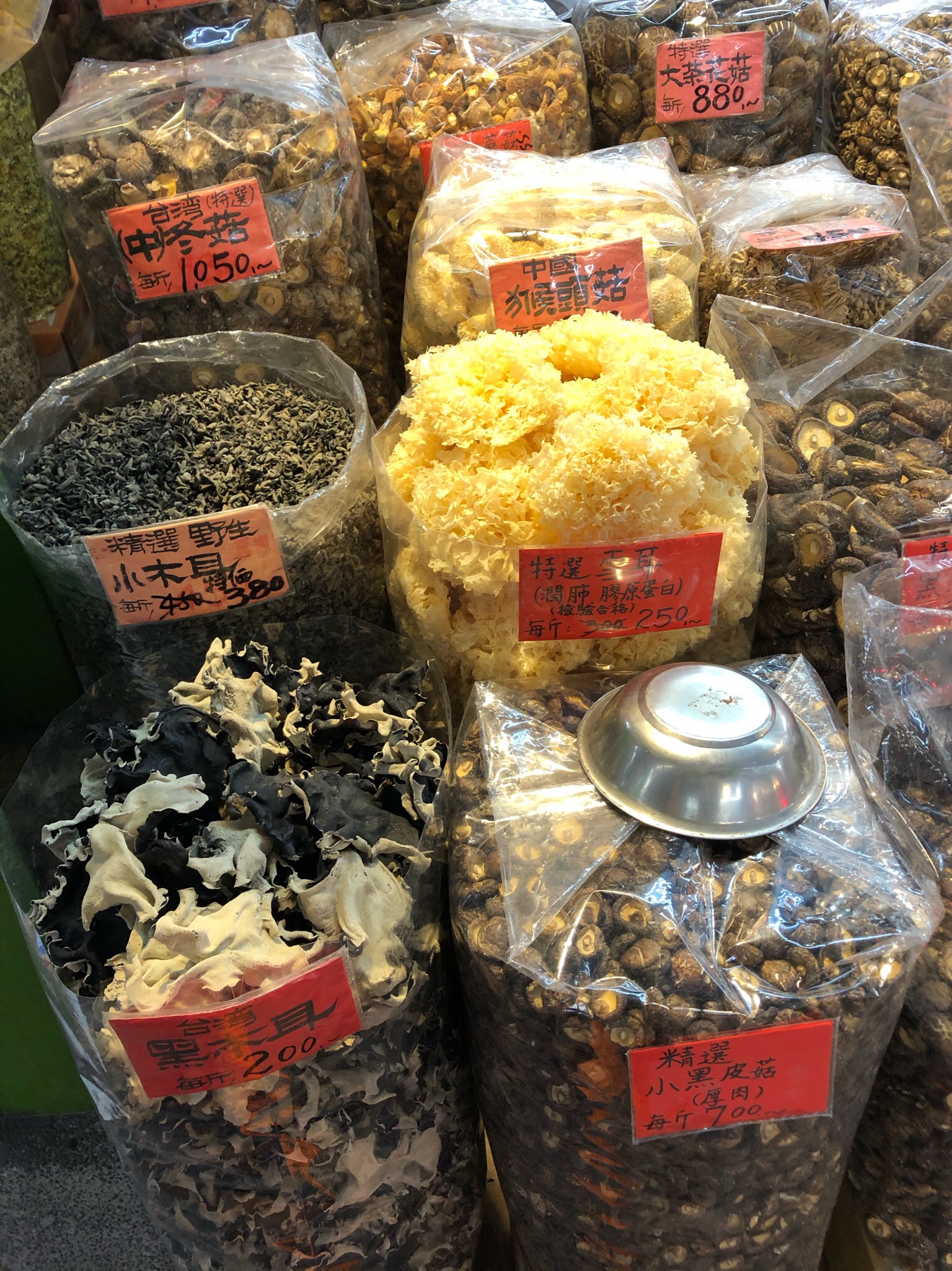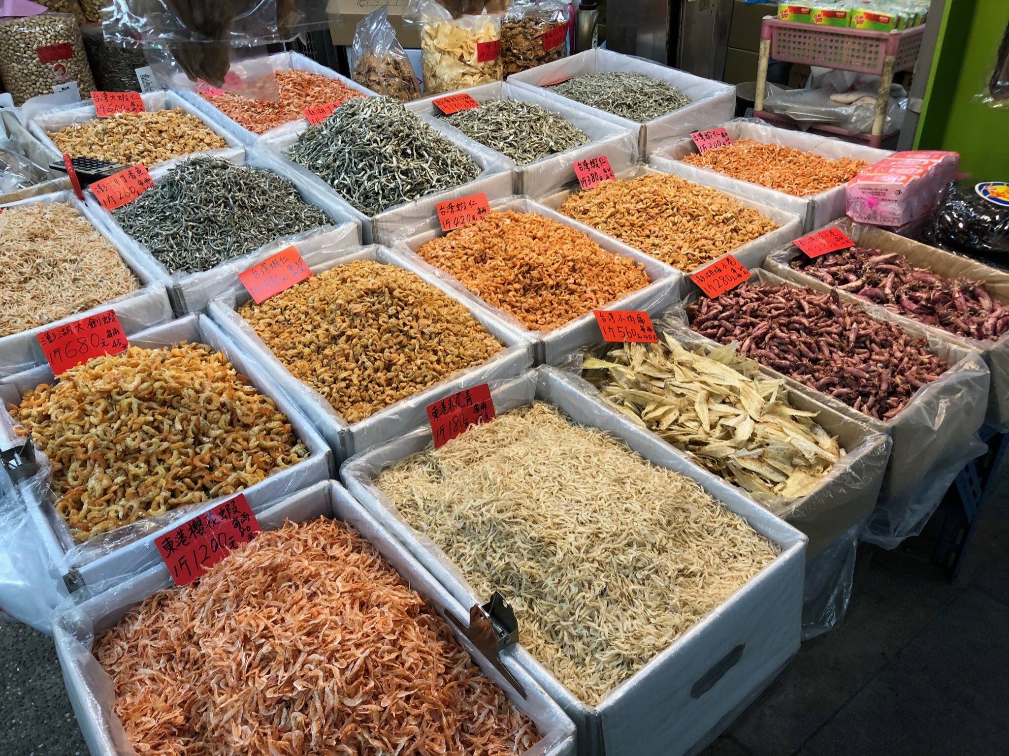 Dry markets are less common than the day markets but are just as special in what’s available. Basically, anything that comes in bulk dry form can be found at a dry market. One can buy a little or buy in bulk at wholesale. It is a window into the myriad of ingredients that go into traditional Taiwanese dishes. Similar to the day markets, each stall has its own specialty and proprietor. There is stiff competition, however, as there could be 5 different shops offering seemingly the same abundance of goods which makes selecting a vendor challenging.